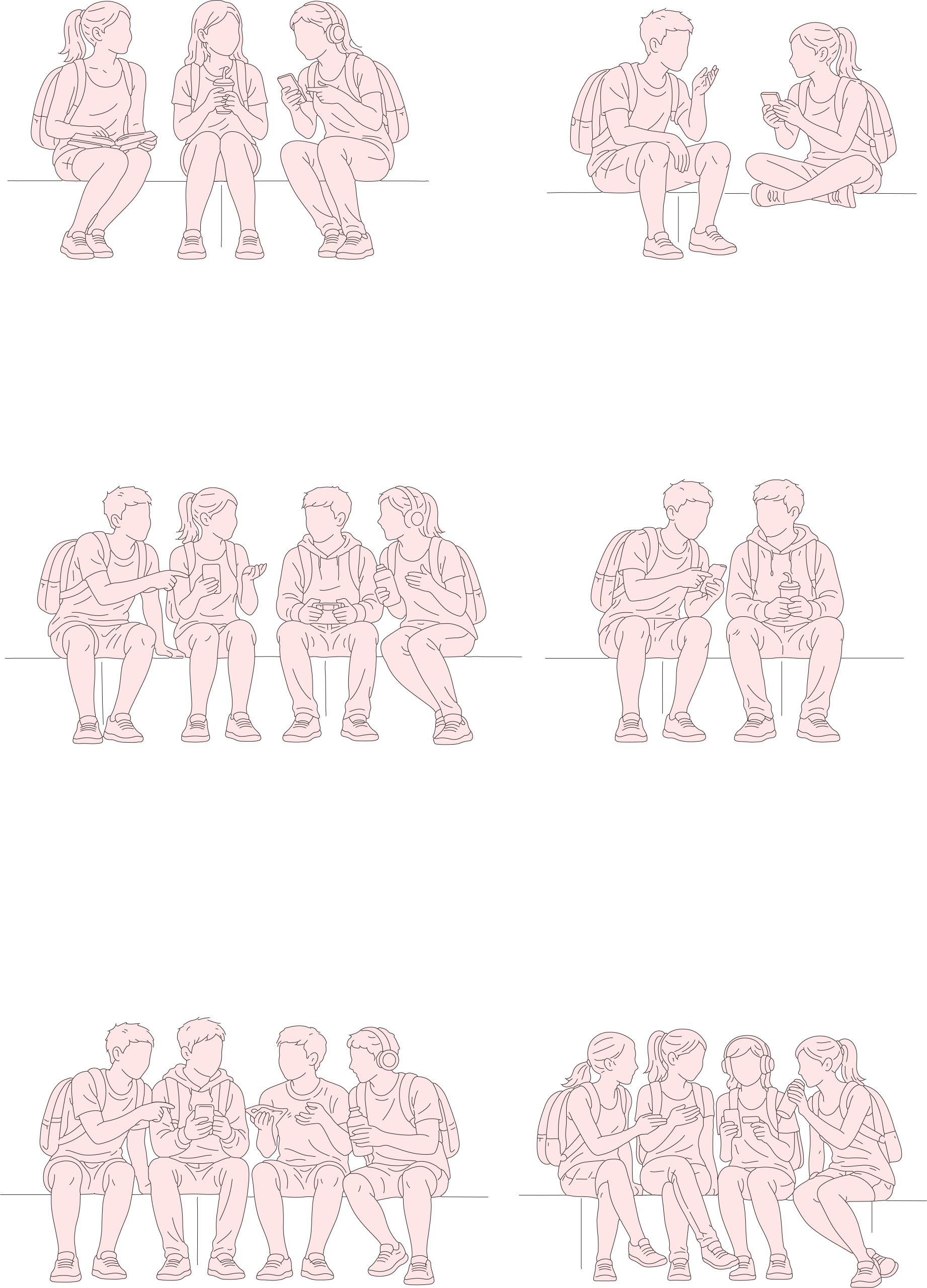 Group of Teenagers sitting on Summer-Spring day, front view, elevation DWG, DXF, PDF, PNG