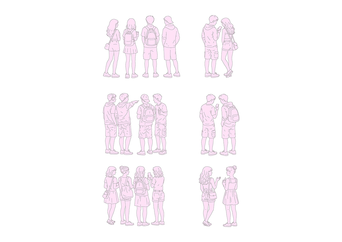 A clean bundle of elevation-style line art illustrations depicting teenagers standing together in summer outfits, shown from the back. Featuring small group interactions, backpacks, and casual gestures, this set is ideal for architectural sections, urban diagrams, and visualizations requiring social presence and human scale.