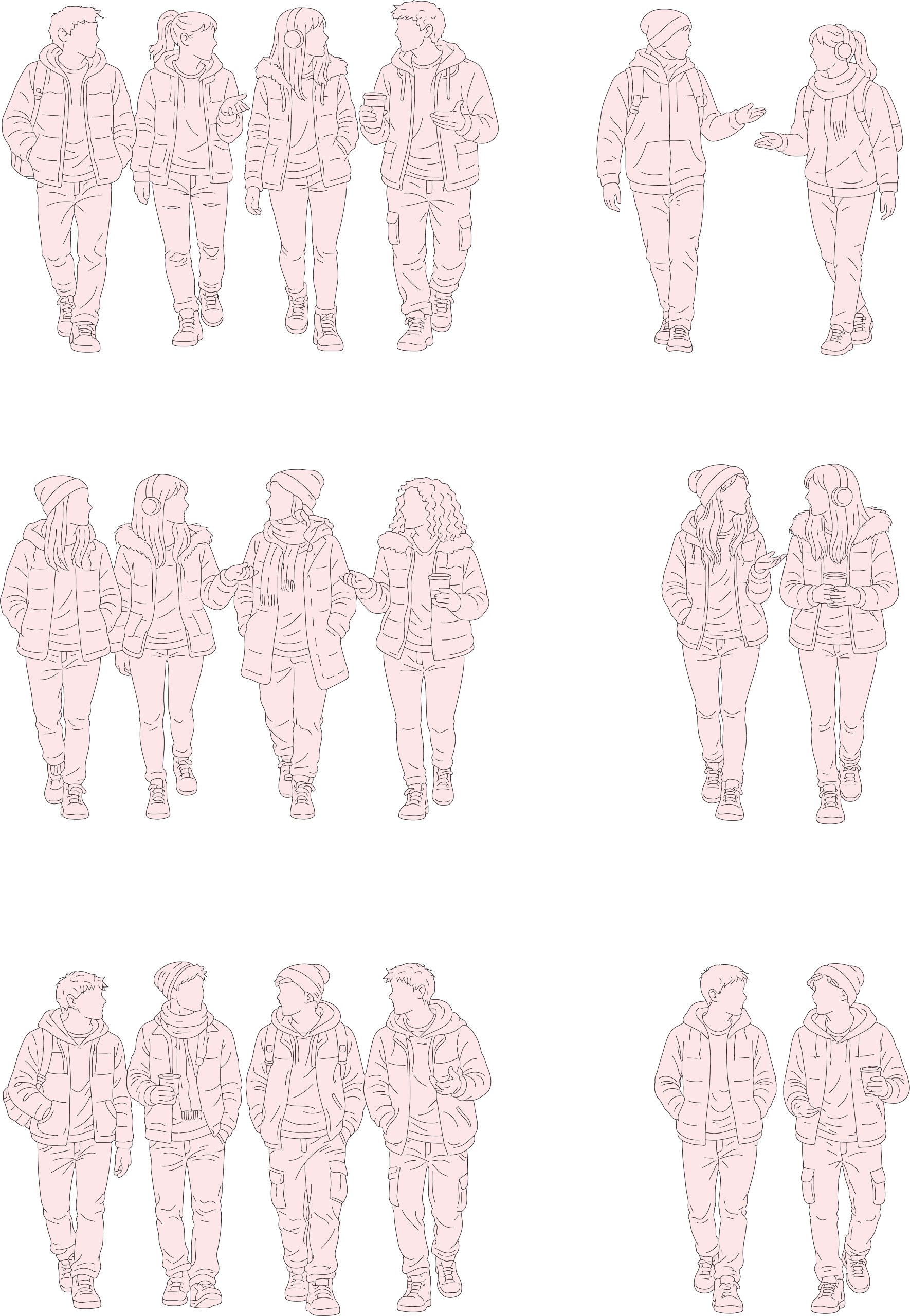 A cohesive set of elevation-style line art illustrations depicting teenagers standing and walking together in winter clothing, shown in a front view. Featuring small group interactions, casual gestures, and seasonal outfits, this bundle is ideal for architectural sections, urban scenes, and visualizations that require social activity and winter context.