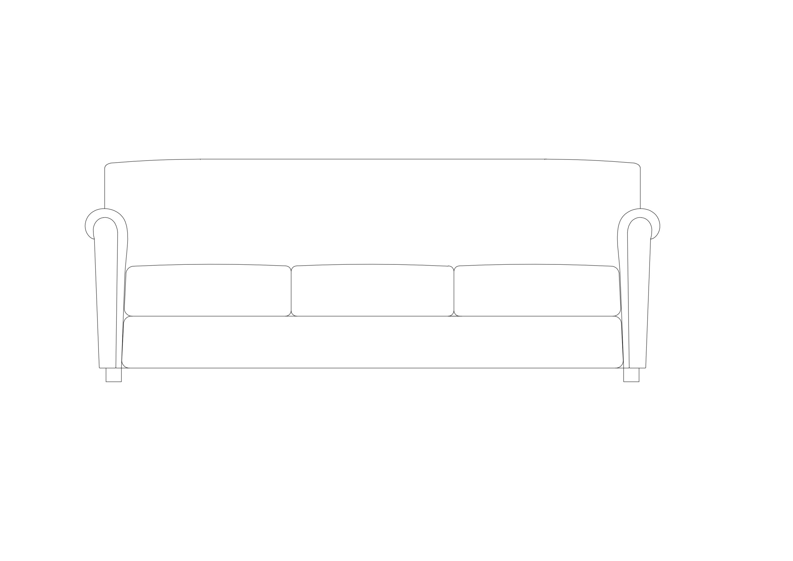A clean, geometric front elevation of a contemporary 3-seater sofa. This block is optimized for interior design boards and construction sections, ensuring a professional aesthetic for your technical drawings.
