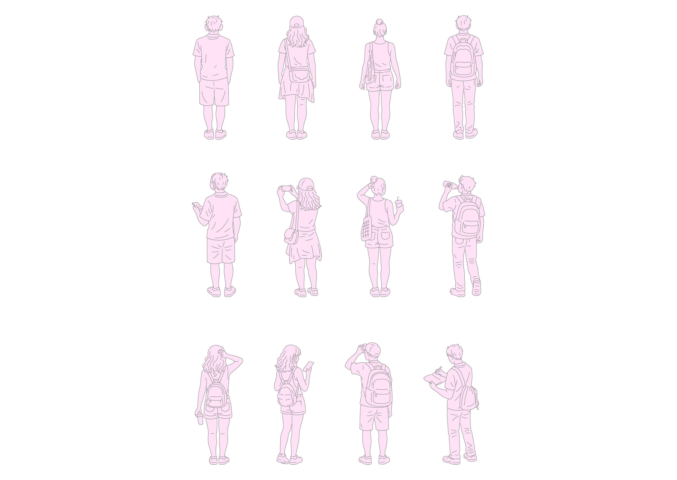 A clean set of elevation-style line art illustrations depicting teenagers walking in summer outfits, shown from the back. Featuring backpacks, bags, and relaxed walking gestures, this bundle is ideal for architectural sections, diagrams, and visualizations that require depth, movement, and accurate human scale.