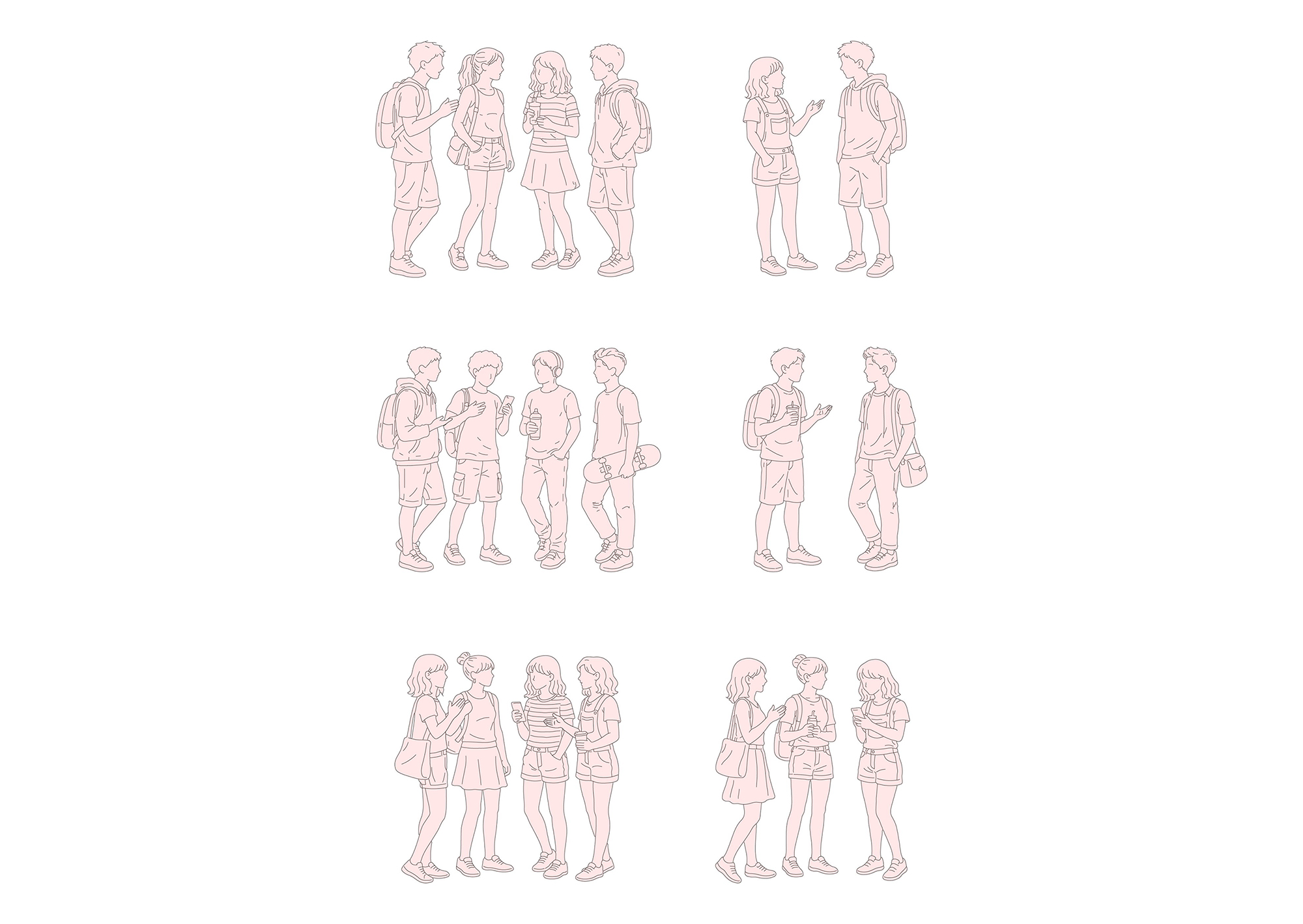 Group of teenagers standing on Summer-Spring day, front view, elevation, DWG, DXF, PDF, PNG